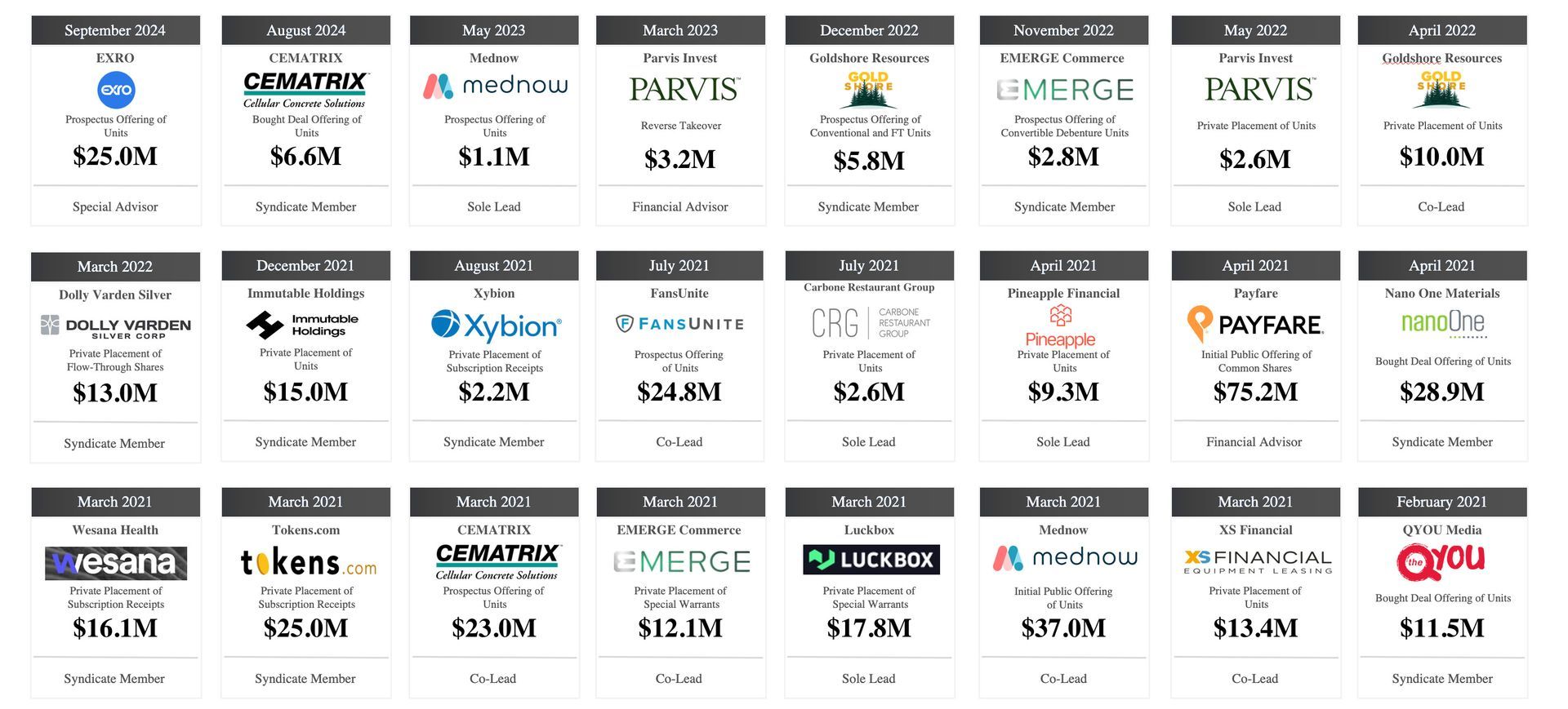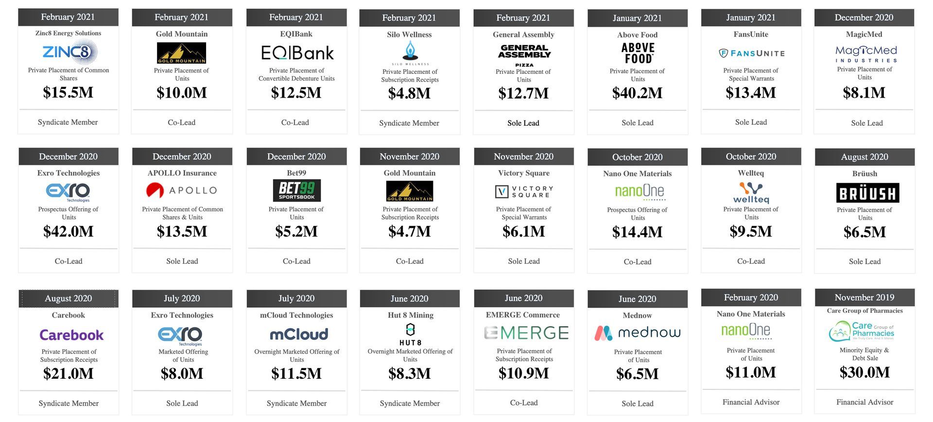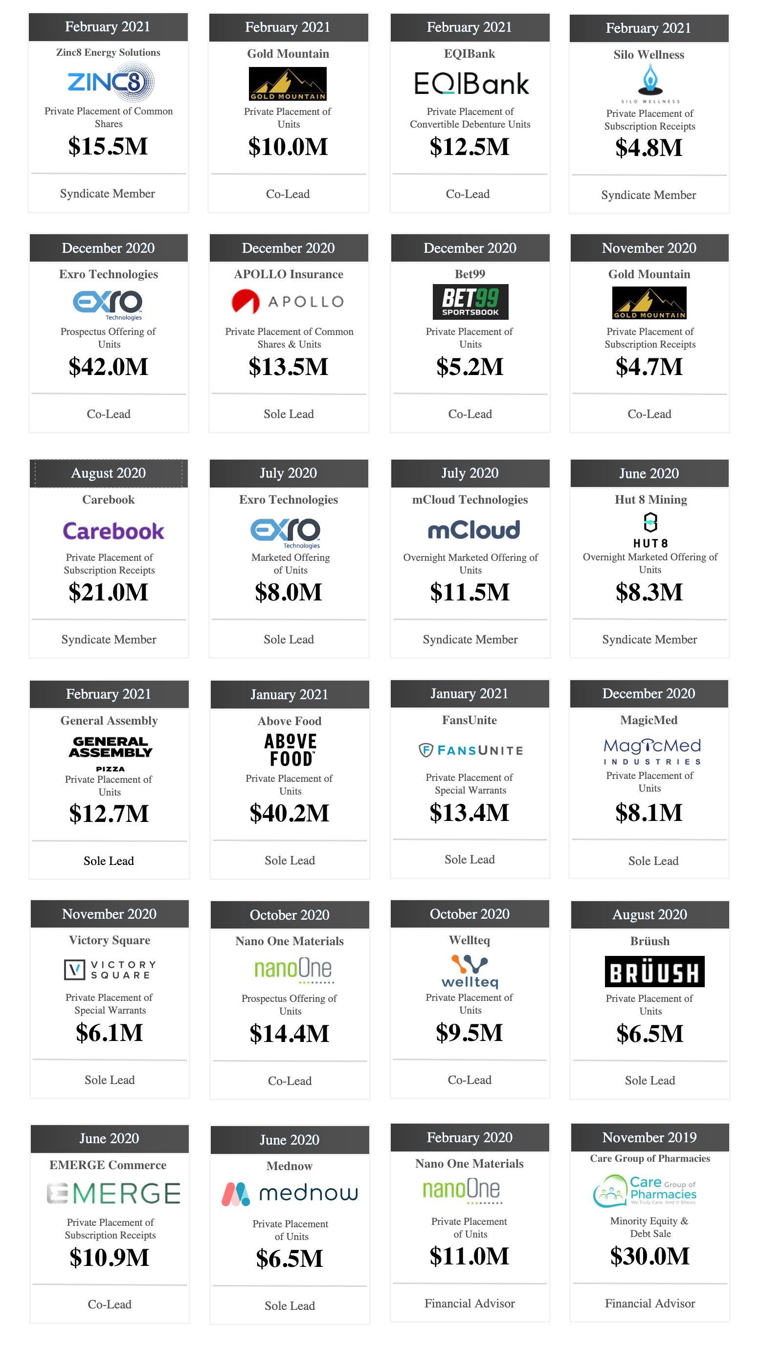 Note: Centurion One Capital may have completed certain transactions while at another investment bank.